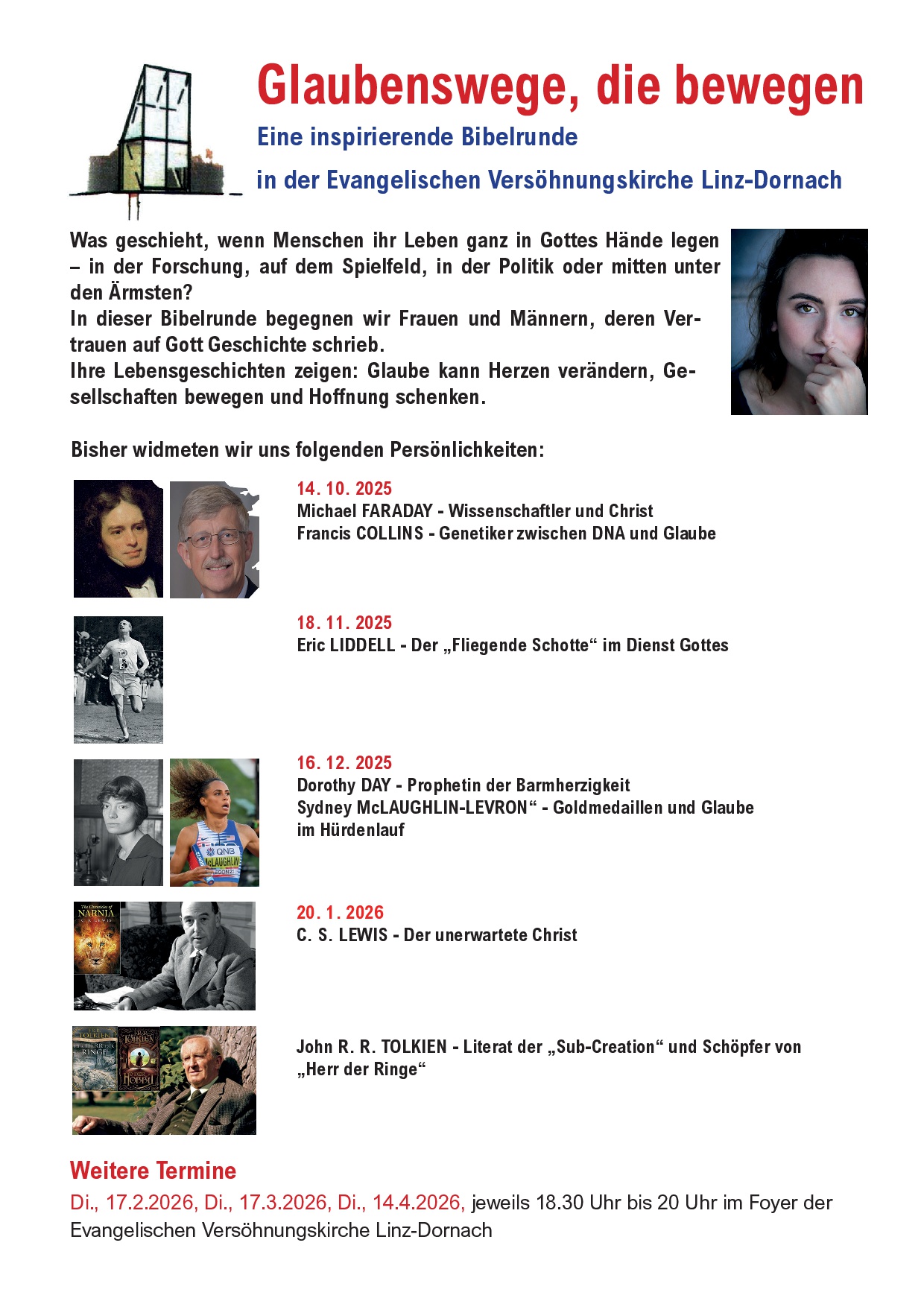 Wir treffen uns 1x/Monat zu Themen, die unser aller Leben betreffen. Bringen Sie Ihre Bibel mit (andernfalls halten wir für Sie eine bereit) und sprechen wir über Gott, das Leben und den Glauben. Es sind keine Vorkenntnisse notwendig; keiner wird geprüft.